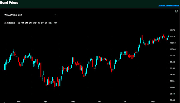 Mortgage bond prices determine home loan rates. The chart below is a one-year view of the Fannie Mae 30-year 5.5% coupon, where currently closed loans are being packaged. As prices move higher, rates decline, and vice versa.