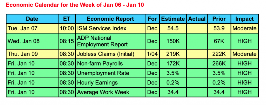 - ADP Private Payrolls will be released on Wednesday followed by the government Jobs Report on Friday that includes Non-Farm Payroll, the Unemployment Rate, and Hourly Earnings.