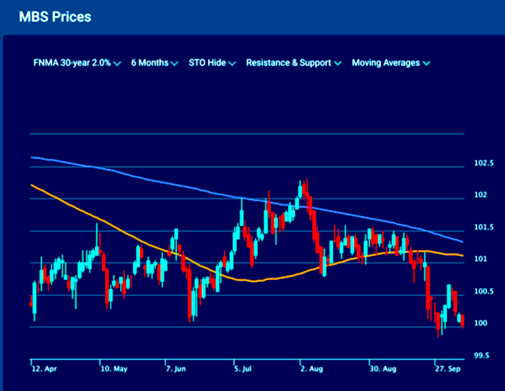Mortgage-backed security (MBS) prices are what determine home loan rates. The chart below is the Fannie Mae 30-year 2% coupon, where currently closed loans are being packaged. As prices go higher, rates move lower and vice versa.