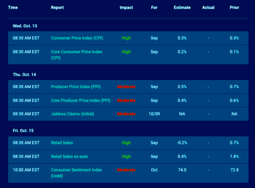 Next week is a short week with Monday closed for Columbus Day. Then things heat up with important inflation readings by way of the Consumer and Producer Price Index. Retail Sales will provide a gauge on consumer spending, which makes up two-thirds of our Gross Domestic Product (GDP). Lastly, the Treasury will sell a boatload of new Treasuries with the bellwether 10-year Note being the highlight. The market will be focused on the buying appetite of the 10-year Note, now that it is clear the Fed will be buying fewer bonds in the near future.