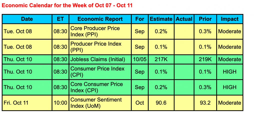 The economic highlight this week will be the inflation reading Consumer Price Index for September. The data comes after the tame reading in August, which was due in part to declining gas prices and energy costs.