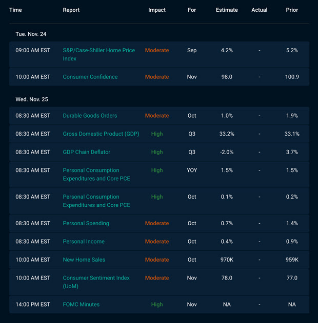 In addition to tracking the aforementioned tug-of-war, next week’s Thanksgiving shortened week brings Durable Goods, GDP, PCE, and another huge round of Treasury supply (which has been pressuring Treasury yields higher). In a holiday week, we sometimes see extraordinary market turbulence — so stay tuned.