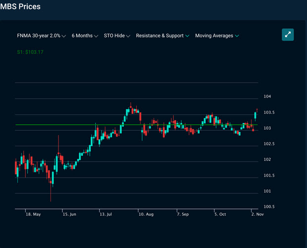 Mortgage-backed security prices bounced sharply higher off of support in response to the election uncertainty. With prices near all-time highs, we are watching to see if prices decline upon the clarity of election results.