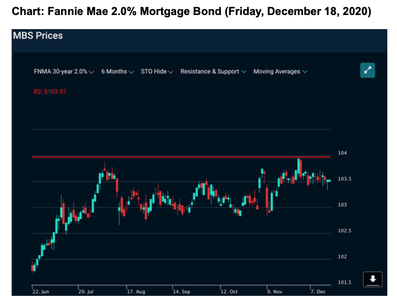 Mortgage-backed securities are what determine home loan rates. The chart below is the Fannie Mae 30-year 2% Coupon, where current closed loans are being packaged. The right side of the chart shows the daily “candles” just below the red horizontal line, which represents the best pricing ever. Follow the vaccine progress and stimulus negotiations, and let us see how prices react beneath this ceiling. A move above this level would usher in the best mortgage rates ever. A decline in prices from here would cause an uptick in mortgage rates.