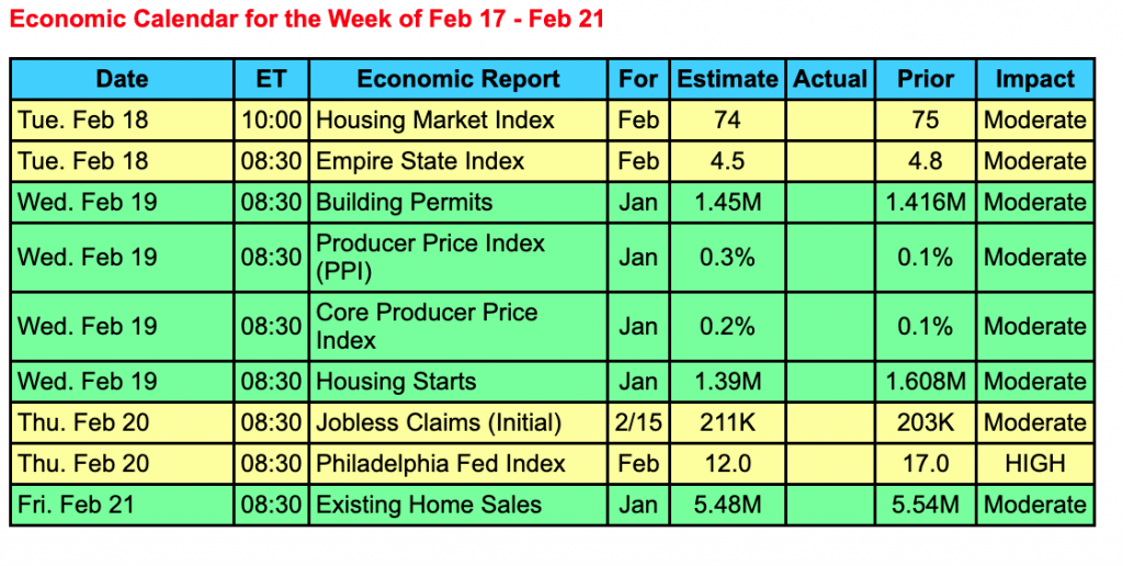 The upcoming week is holiday-shortened with the financial markets and most banks closed on Monday in observance of Presidents’ Day.