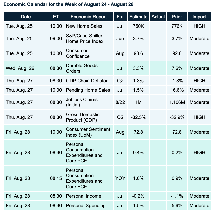 Next week, the economic calendar delivers a few potentially market-moving releases like New Home Sales, Q2 GDP, Consumer Confidence, Durable Goods, and the inflation reading Core PCE.