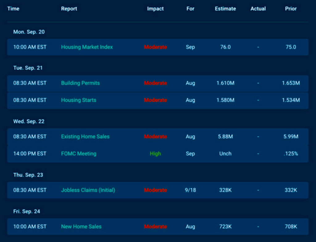 There are some housing reports and other economic readings which would normally move the markets, but they all take a back seat to Wednesday’s Fed meeting. On Sept 22nd at 2 pm, the Fed will deliver their Monetary Policy Statement. This will be a big event.