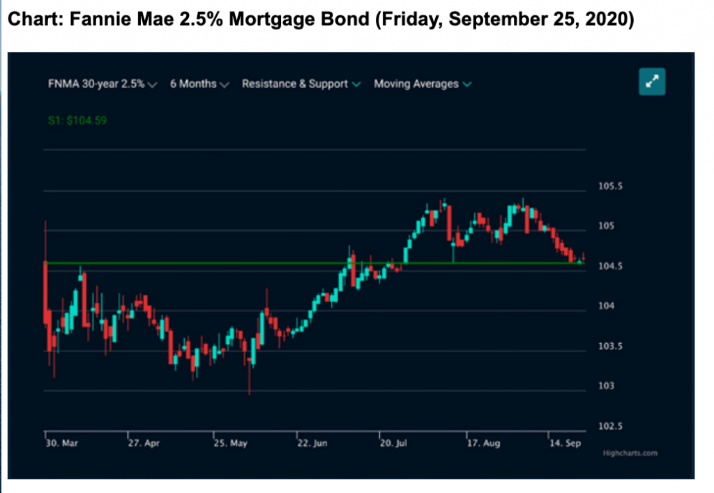 A peek at the right side of the chart shows the decline in MBS prices overall in September. This means that any improvement in rate would be limited. At the same time, what is encouraging is that prices remain above “support” at the green horizontal line. If prices stay above this line, we may see further improvement in rate. The opposite is also true.